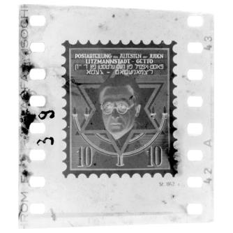 In the centre: a menorah with the symbol of the Star of David; within the star is a portrait of Mordechai Chaim Rumkowski.