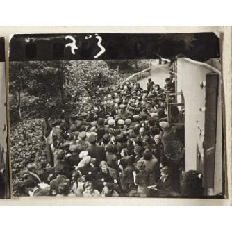 Mordechai Chaim Rumkowksi, "Elder of the Jews" and Chairman of the Judenrat, speaks to a crowd, surrounded by ghetto police