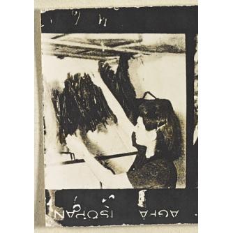 A woman hanging feathers for hats in a ghetto workshop ("ressort")